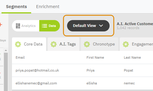The Data Panel gives a view of the details of each Customer in the selected Segment. Attributes for all Distil Data Sources as well as Distil AI Tags and Enrichments are shown as columns. Tabs at the top of the panel group Attributes by Data Source, such as Core Data, AI Tags and Chronotypes. Clicking these tabs enables easy navigation to the Attributes for that Data Source.