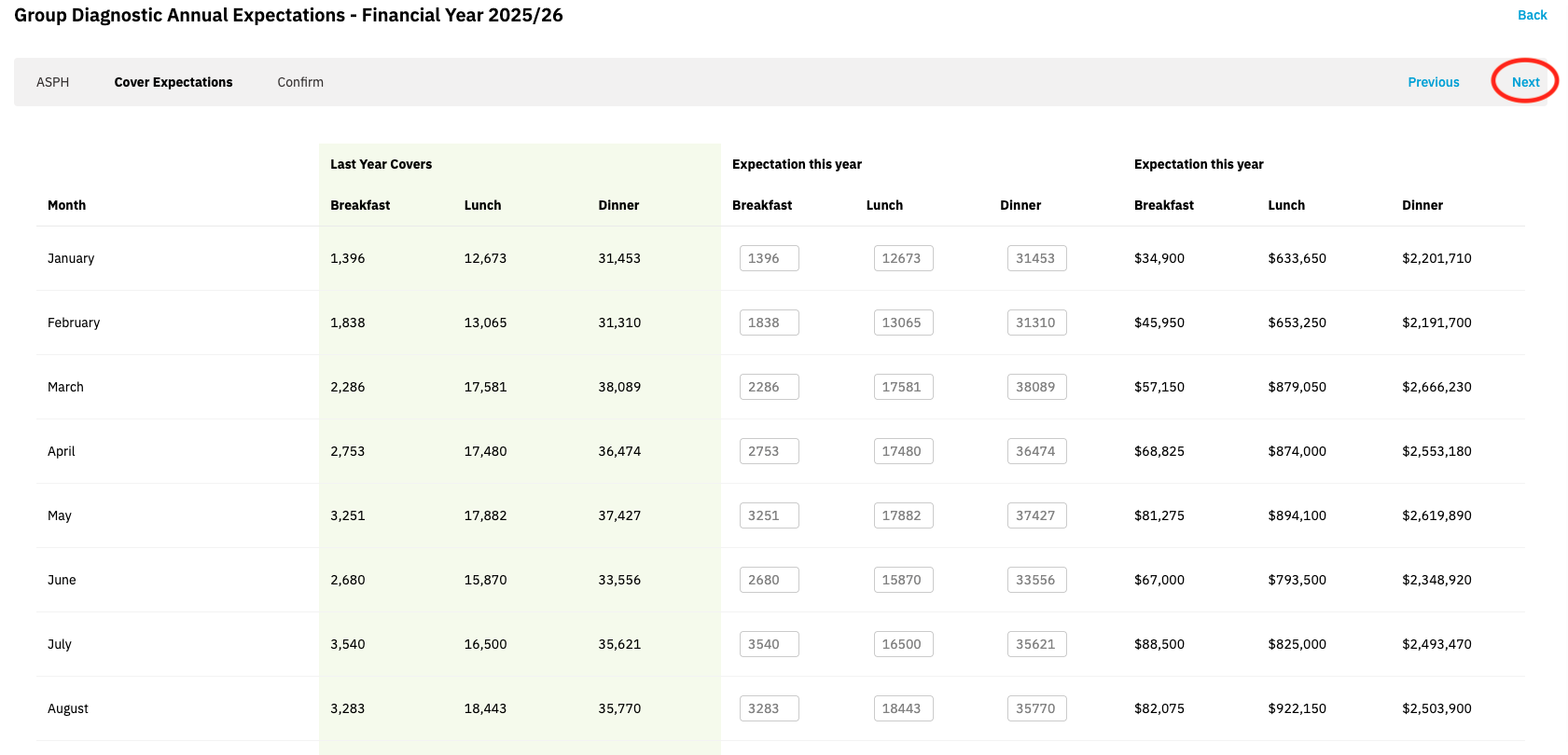 You can edit ASPH by individual service and venue. Alternatively, you can set all to last year's performance or the market average for your cuisine, price quartile and location. You can edit these figures at any time.