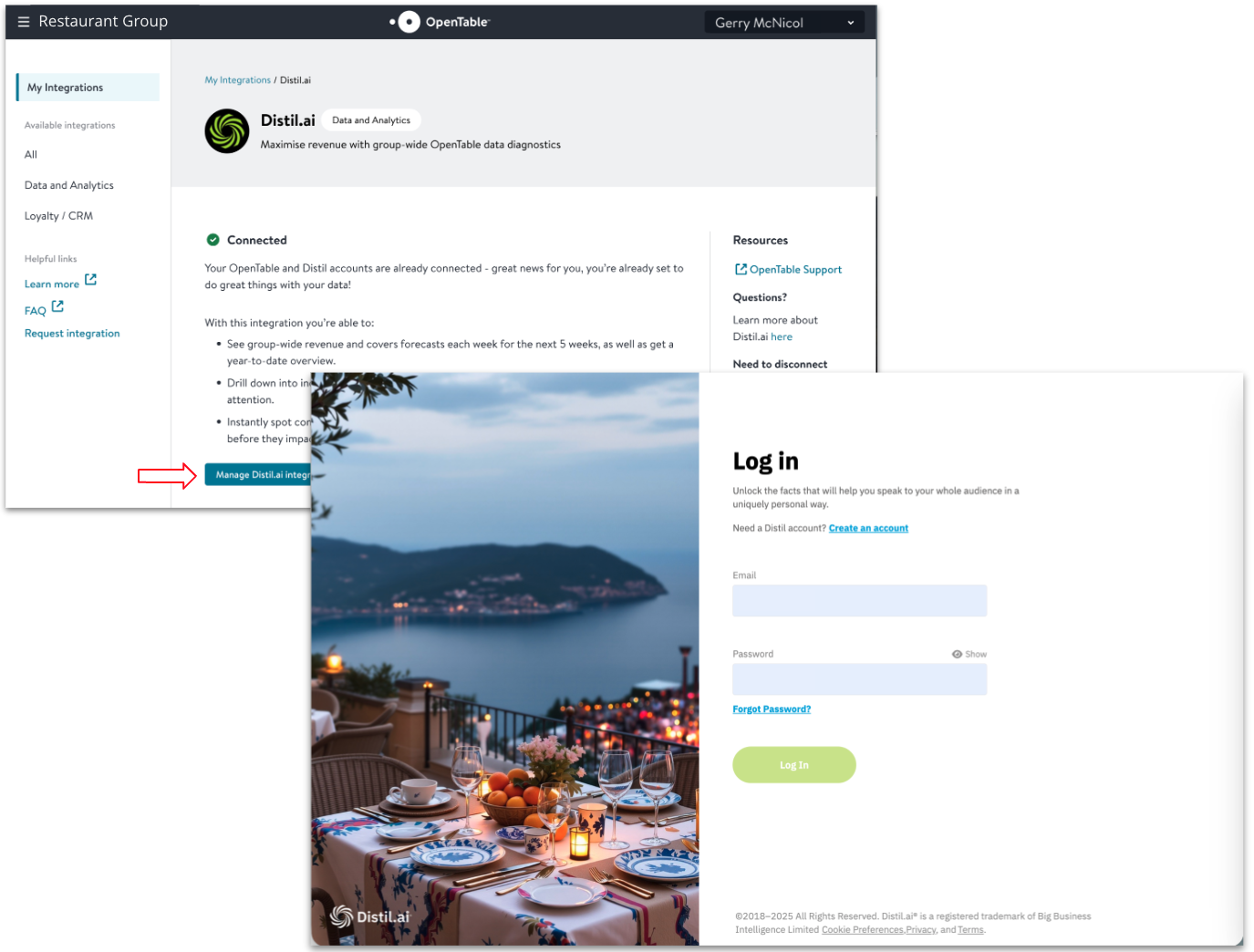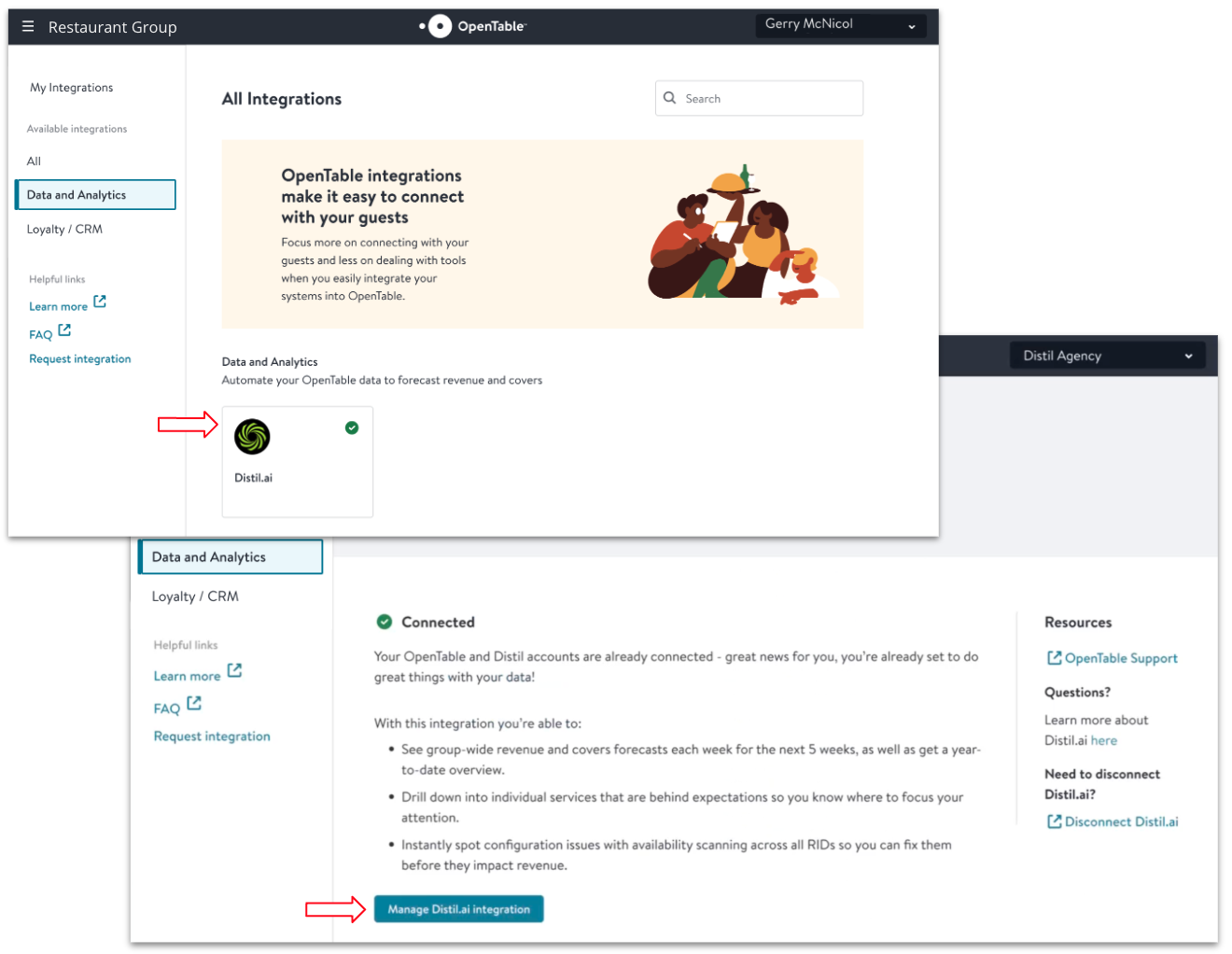 Distil AI can be accessed by selecting the Manage Distil.ai integration button from within OpenTable guest center.