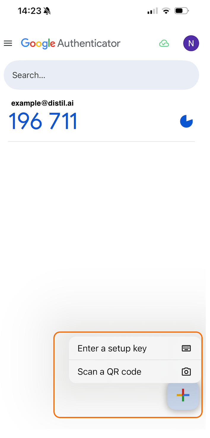 Sign in to your Distil account and, when prompted, open Google Authenticator and tap "+" on the bottom right corner.